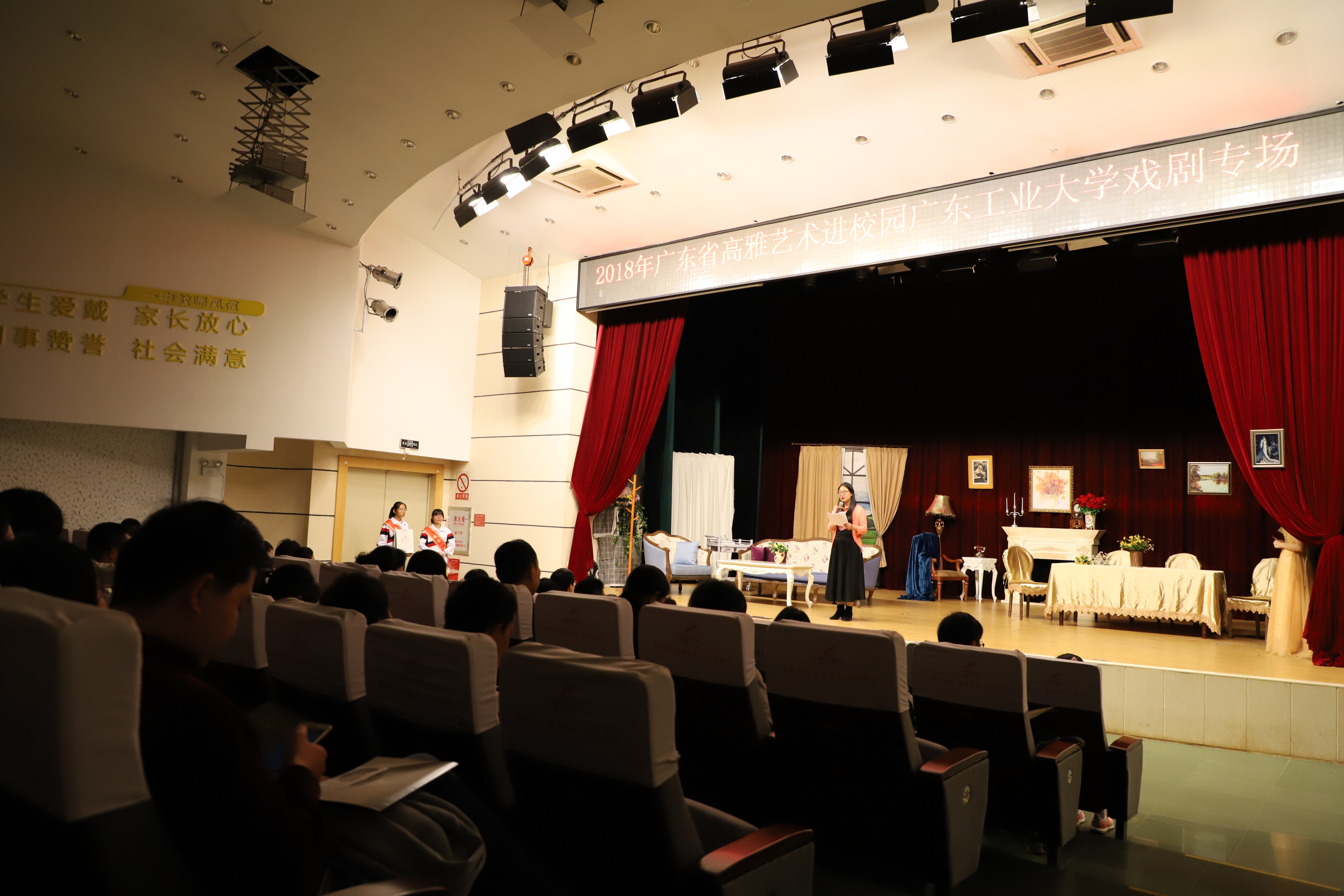 2018年12月23日下午三点整,由广东省教育厅、广东省文化与旅游厅、广东省财政厅主办,广东工业大学及珠海市第一中学承办的“2018年广东省高雅艺术进校园活动”——“戏剧专场演出”于我校报告厅举行。