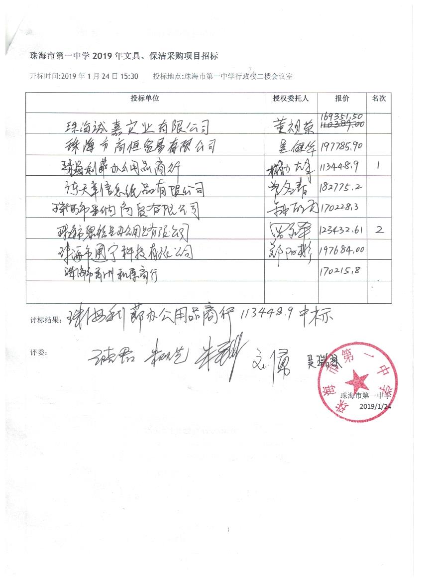 珠海市第一中学2019年文具、保洁采购项目招标结果公示