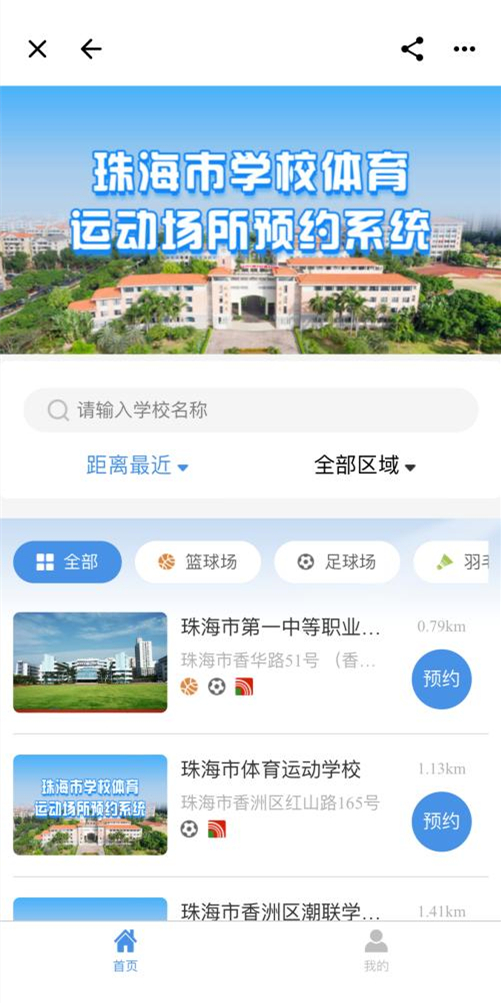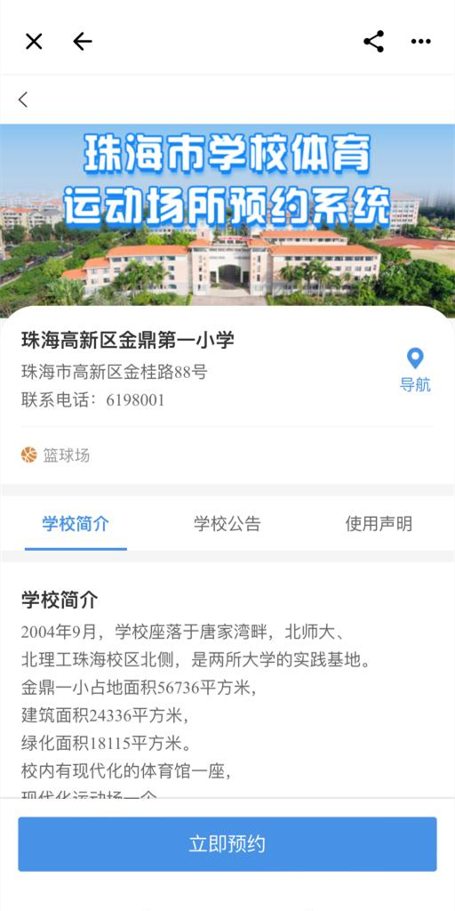 3、在运动场所预约模块首页,选择想要预约的“学校”,点击预约,进入学校详情页,请仔细阅读《预约须知》和《个人承诺书》后点击“立即预约”进行预约;