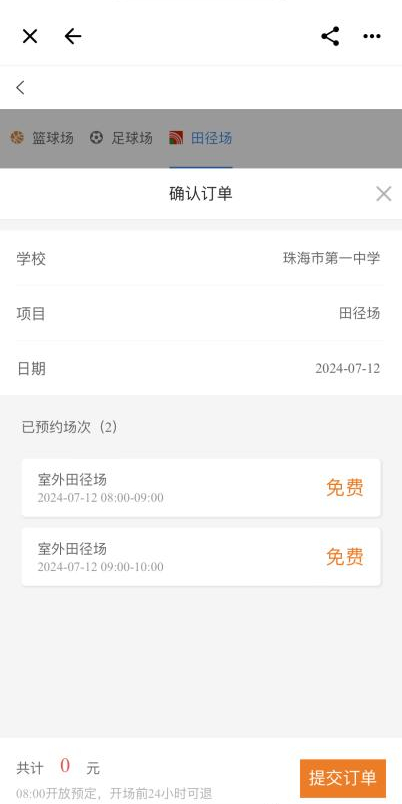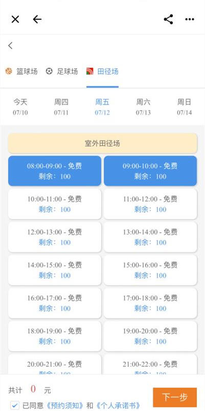 4、选择想要预约的球场、具体时间段,点击“下一步”,然后确认预约信息,点击“提交订单”,预约成功,即可查看预约详情;
