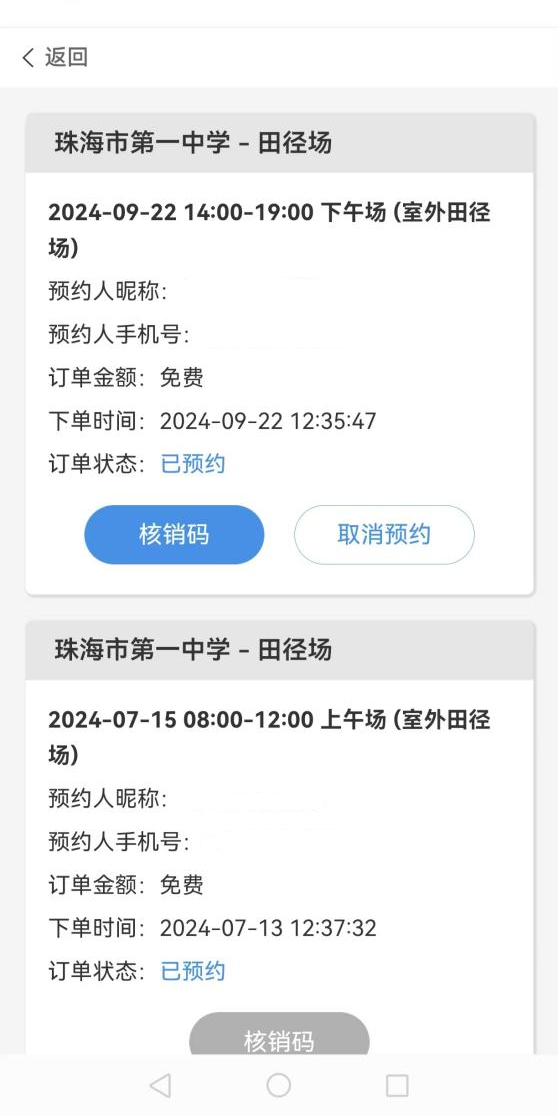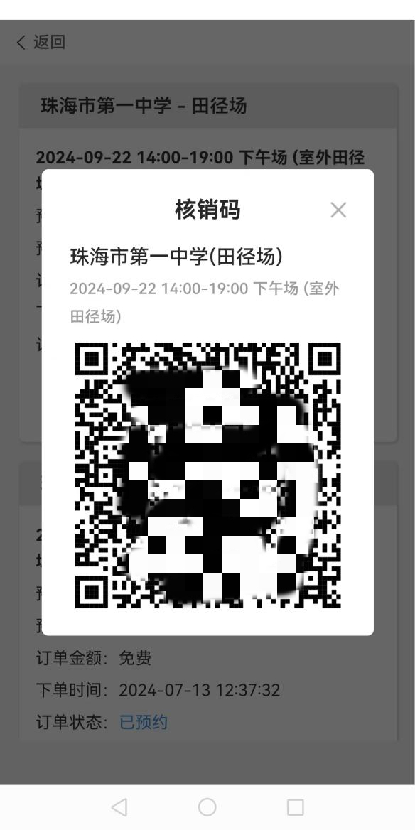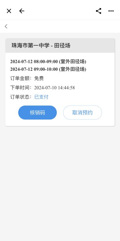 5、完成以上步骤后,即可预约成功。进入校园时,可在珠海市学校体育运动场所预约系统中“我的-我的预约”中查看核销码。注意:如果不能及时前往,可以在此取消预约。