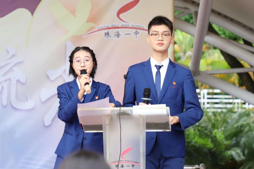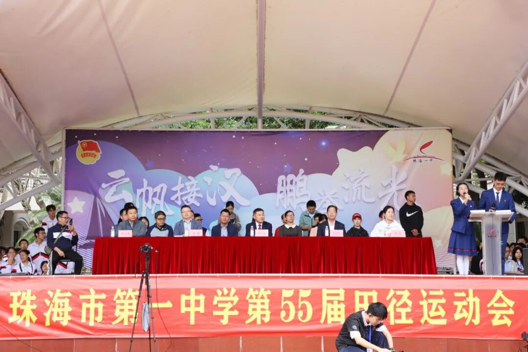 当第十五届全国运动会口号“激情全运会 活力大湾区”在各大城市跃动之际,为响应“全民全运”理念的号召,珠海市第一中学于2025年11月13日上午在运动场举行主题为“云帆接汉 鹏举流光”的第五十五届田径运动会开幕式。我们旨在通过举办校运会,激励一中学子弘扬团结协作、勇于拼搏、超越自我的精神,将体育竞技的奋斗激情,转化为日常学习生活中攻坚克难的锐气。珠海市第一中学党委书记张六安,副校长于红仁、赵强、薛冰、罗志勇以及各部门、年级中层干部共同出席开幕式。开幕式由高一(14)班林欧泽玥、高一(26)班王范荣共同主持。