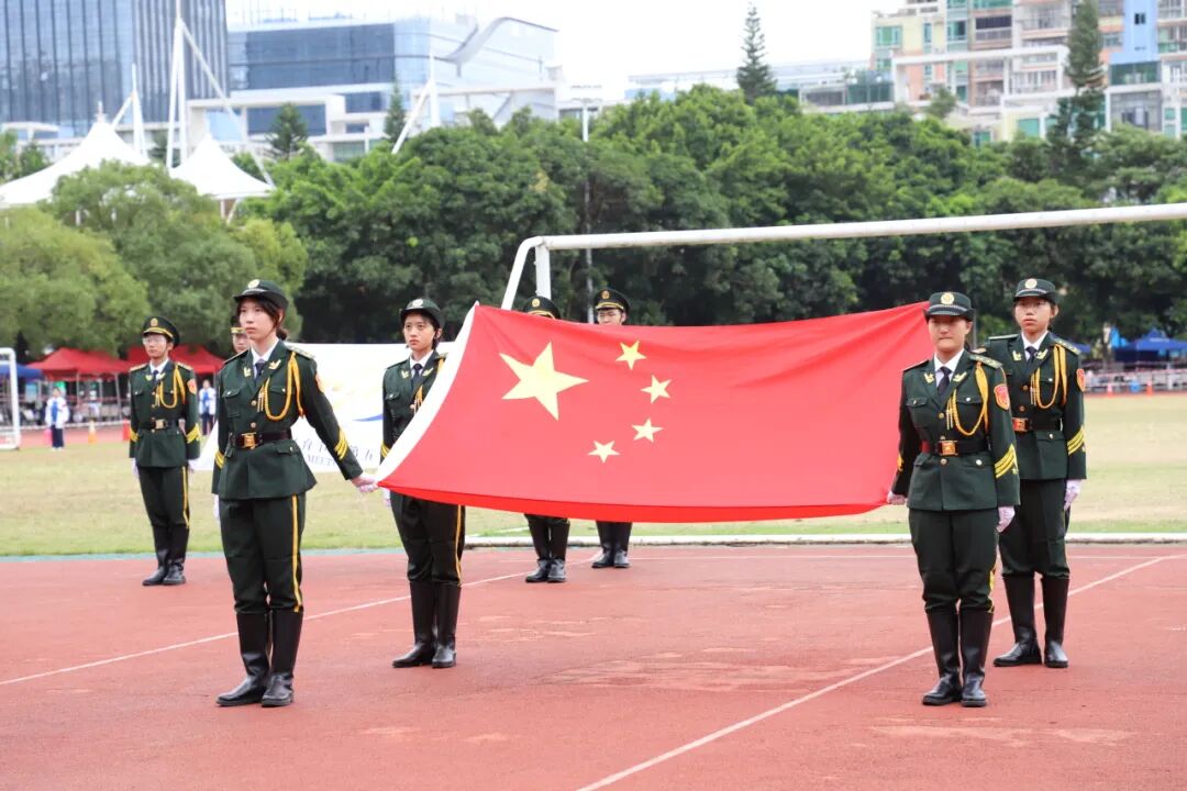 伴随着雄壮国歌,五星红旗冉冉升起。全体师生庄严肃立,奏唱国歌。此刻,爱国情怀在全体师生的心中激荡,全民全运理念的弘扬与体育拼搏的信念也在内心交融,为赛场注入了强劲的精神动力。