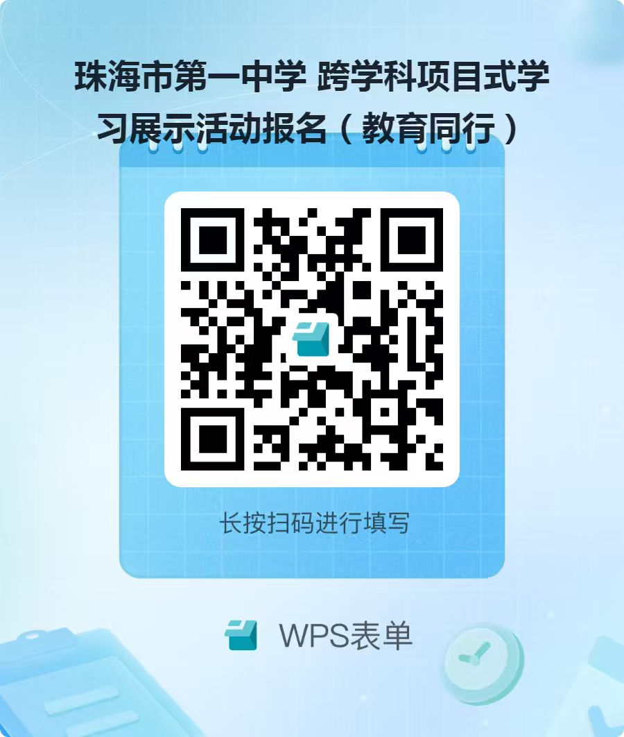 此次项目式学习活动是我校将“创美育人”办学理念与跨学科融合教学实践有机结合的又一次积极探索。我们诚挚邀请珠海市第一中学教育集团各成员校教师,以及全市各学校的教育同仁莅临活动现场,参与观摩交流并提出宝贵建议。有意参加的教师,可长按扫码填写入校信息完成报名。