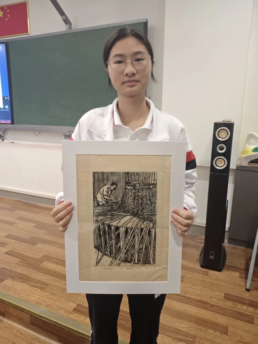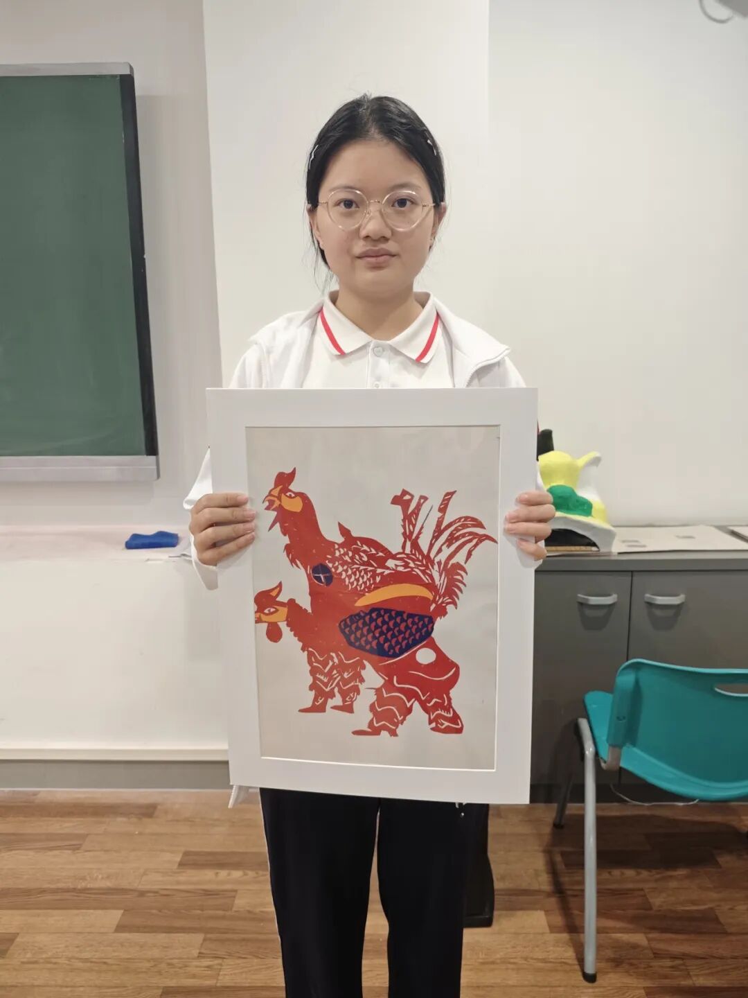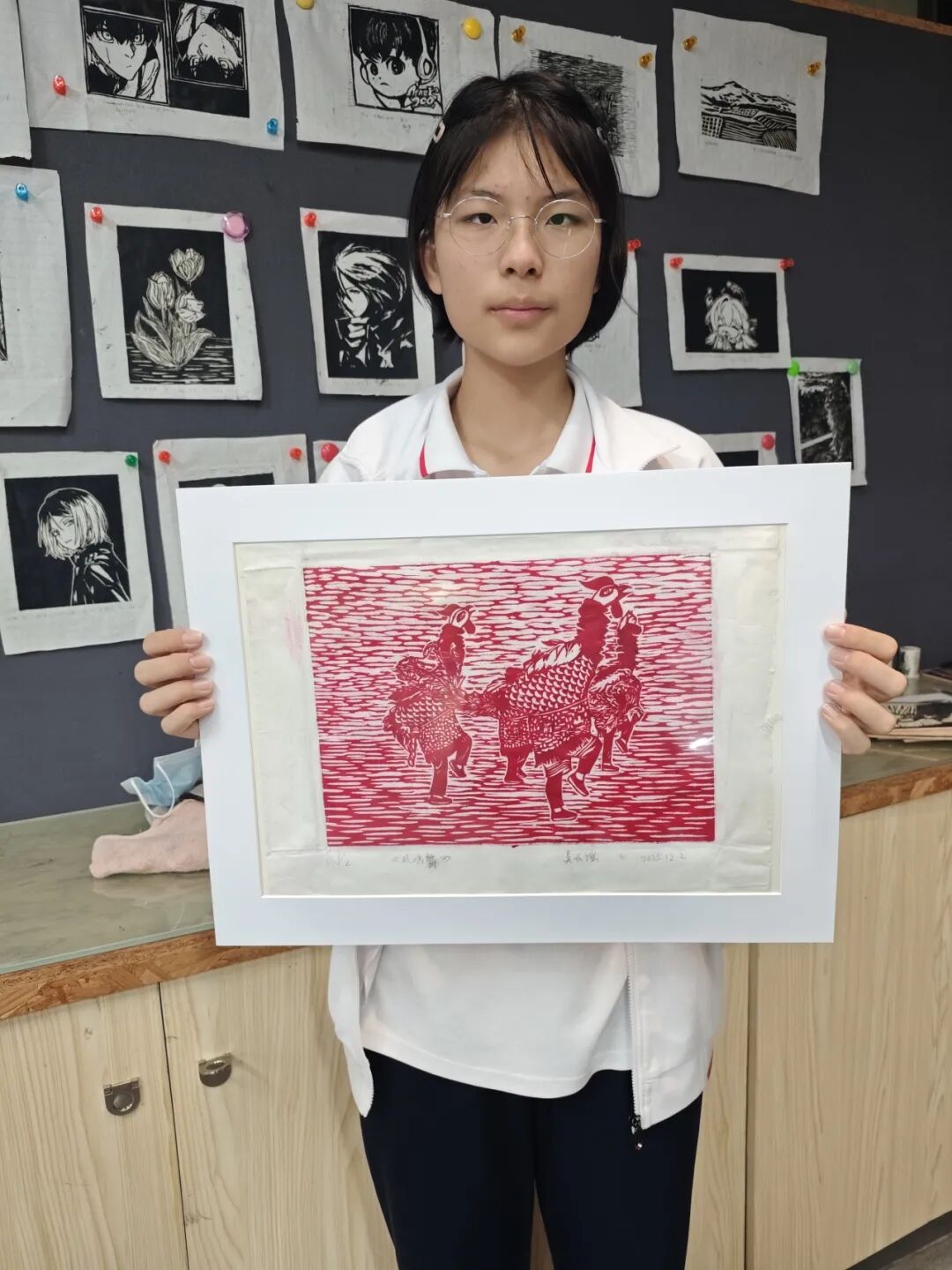 赵寻绎老师:在该项目中,我目睹了核心素养在教学中的真实落地。23名学生运用版画、摄影等多元艺术形式,将三灶舞狮、斗门水上婚嫁等五项非遗活化再现。他们自发利用课余时间沉浸创作,美术教室常灯火通明。当凤鸡舞传承人说“凤鸡一抖,福气就到”时,学生迅速将吉祥寓意转化为视觉节奏,并将感悟写入创作说明,实现了文化情感的无声浸润。成果展示时,学生互评中出现了“配色还原嫁衣红”、“细节呈现浪花纹”等评语,表明他们的审美判断已与地方文化记忆深度联结。问卷显示九成学生期待后续活动,社团内形成了主动传承的可持续生态。这让我深信:在真实情境、充足支持与有效评价的框架下,传统文化完全能在青少年手中焕发新生,并反哺其文化认同。这种教学相长的双向滋养,正是跨学科美育的价值核心。