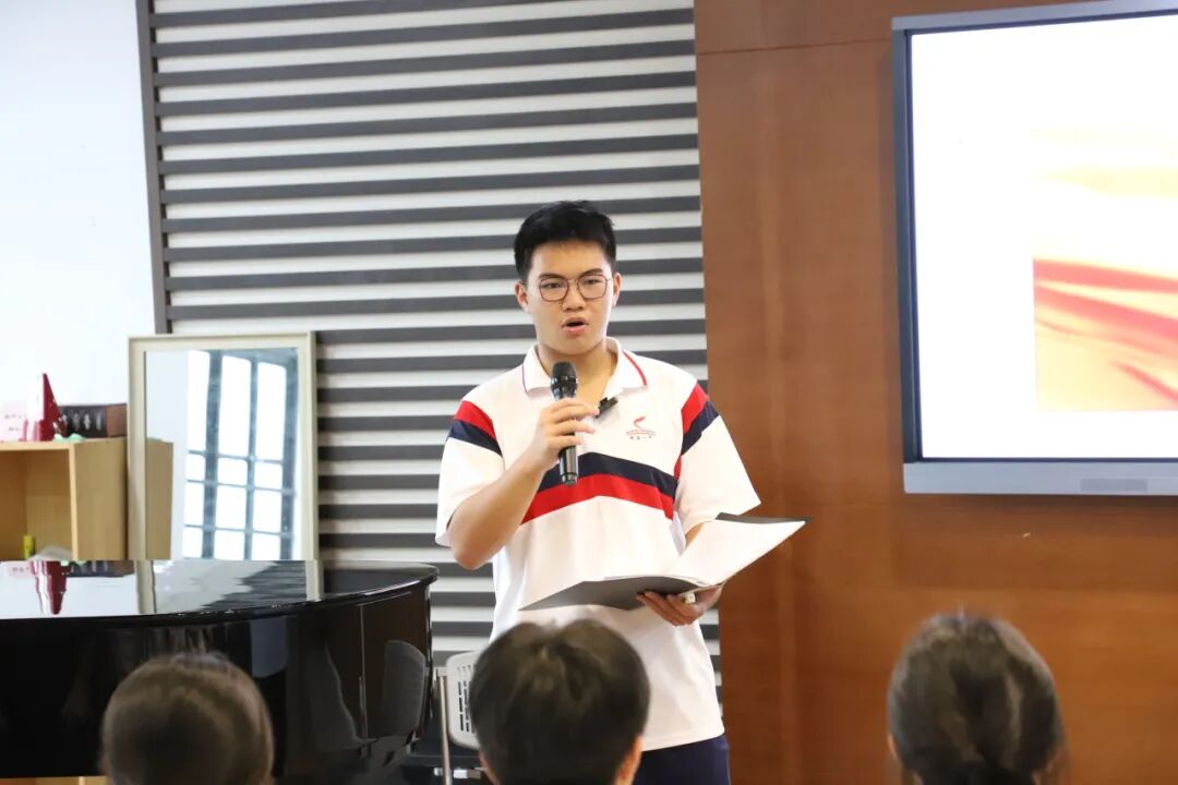 高二(2)班 马溪蔓:在本次音乐与政治的跨学科探究中,我深入理解了红色旋律的时代精神。通过分析《七子之歌·澳门》、《我爱你 ,中国》等经典,我与组员共同创作了四手联弹钢琴曲《逐梦星火》。这次学习让我深刻认识到音乐鼓舞民族、引领精神的力量。作为新时代青年,我们必将承载时代所托,勇担复兴大任,在攻坚克难中创造未来。