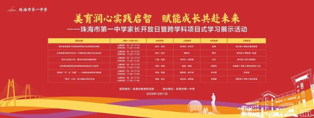 当创美育人精神与现代跨学科实践深情相拥,当知识壁垒在真实探究中悄然消融,珠海市第一中学“美育润心·实践启智”跨学科项目式学习活动,于2025年12月11日下午在校园内圆满落幕。本次活动由珠海市教育研究院全程指导、珠海市第一中学精心承办,以立德树人为根本,紧扣新时代基础教育课程改革方向,深度践行教育部及广东省教育改革相关文件精神,将我校“用美的教育造就美的新人”办学理念融入跨学科实践,为师生呈现了一场兼具理论深度与实践温度的教育盛宴。这次活动,吸引了北京师范大学珠海校区师生、澳门培道中学、阳西县第一中学及全市各科教师近200人前来交流学习指导,取得了很好的效果。