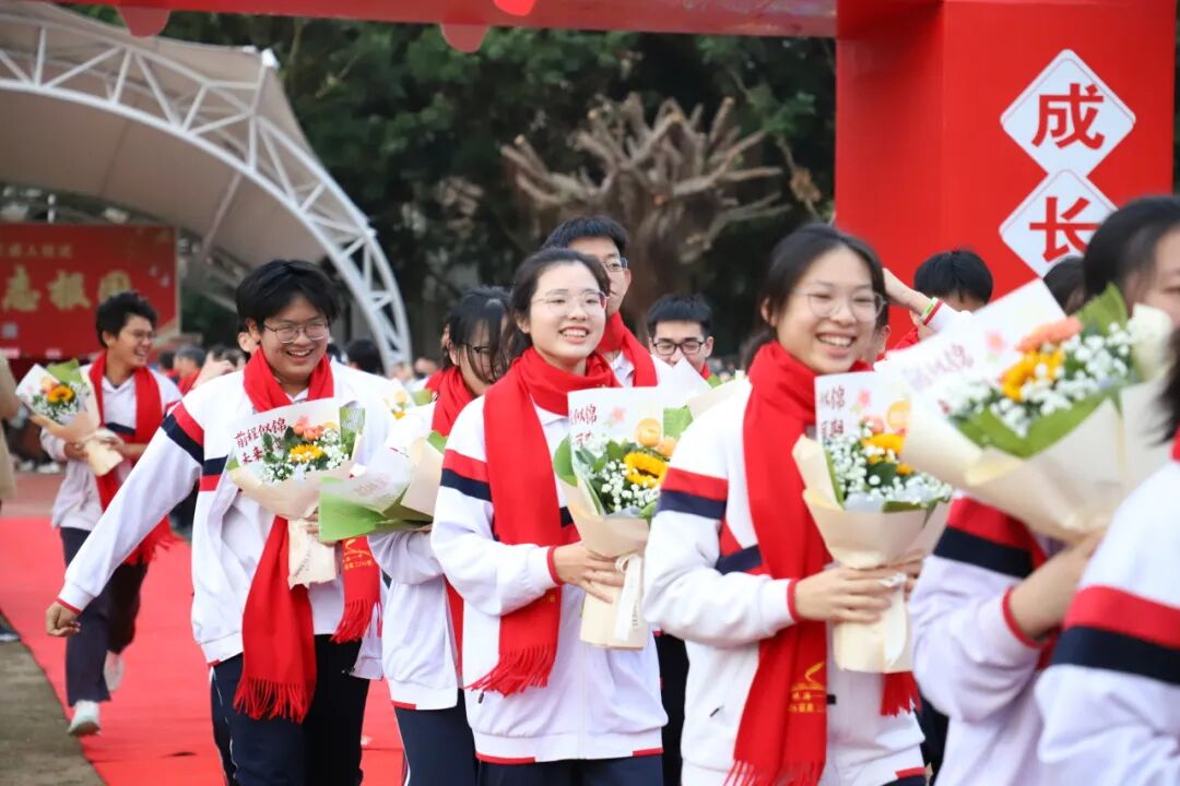 鼓乐铿锵,声震云霄;少年意气,挥斥方遒。伴随着18下鼓声与《我听见时光的声音》的旋律,高三同学们手持横幅、高喊口号、昂首阔步、神采飞扬地走过成人门。此门既越,跨过青涩懵懂;双肩承重,敢许家国山河。老师们击掌勉励、家长们深情注视,为同学们致以真挚的祝贺。一张张灿烂的笑脸,一个个挺拔的身影,都在诉说着:十八而志,未来可期!从此山海可赴,青春向阳而生!
