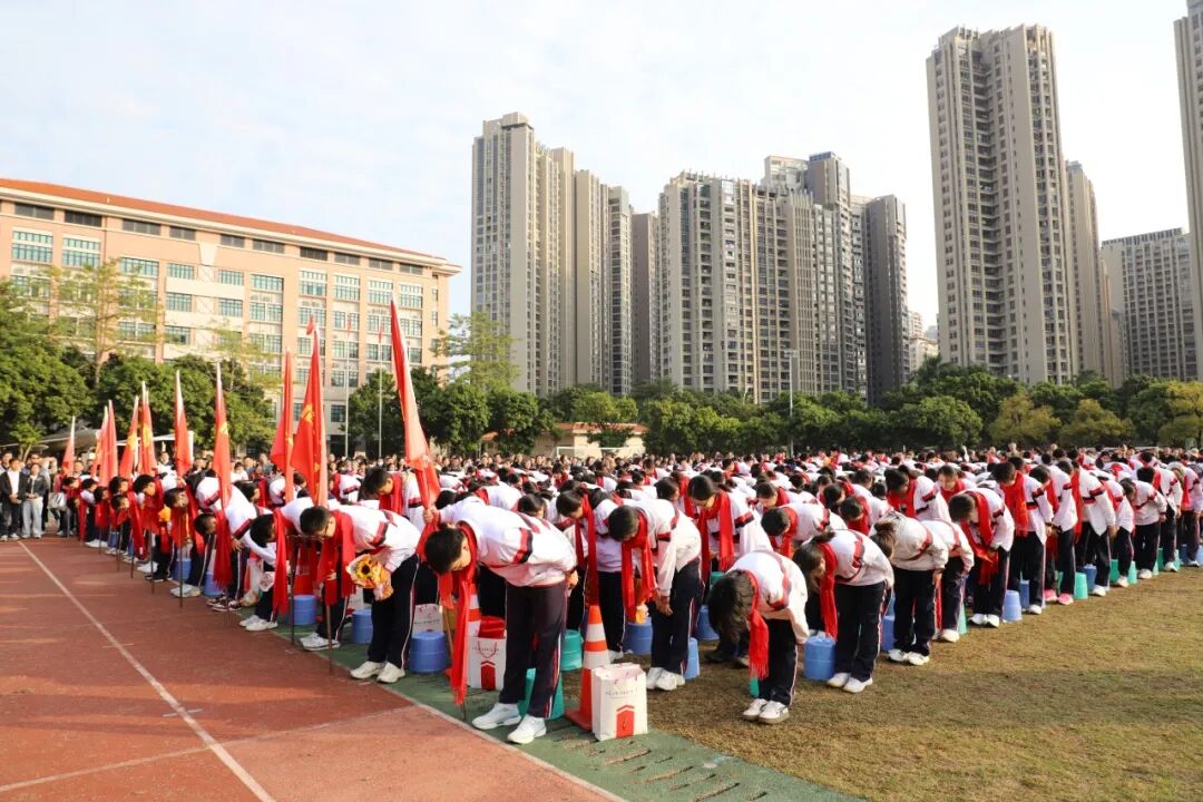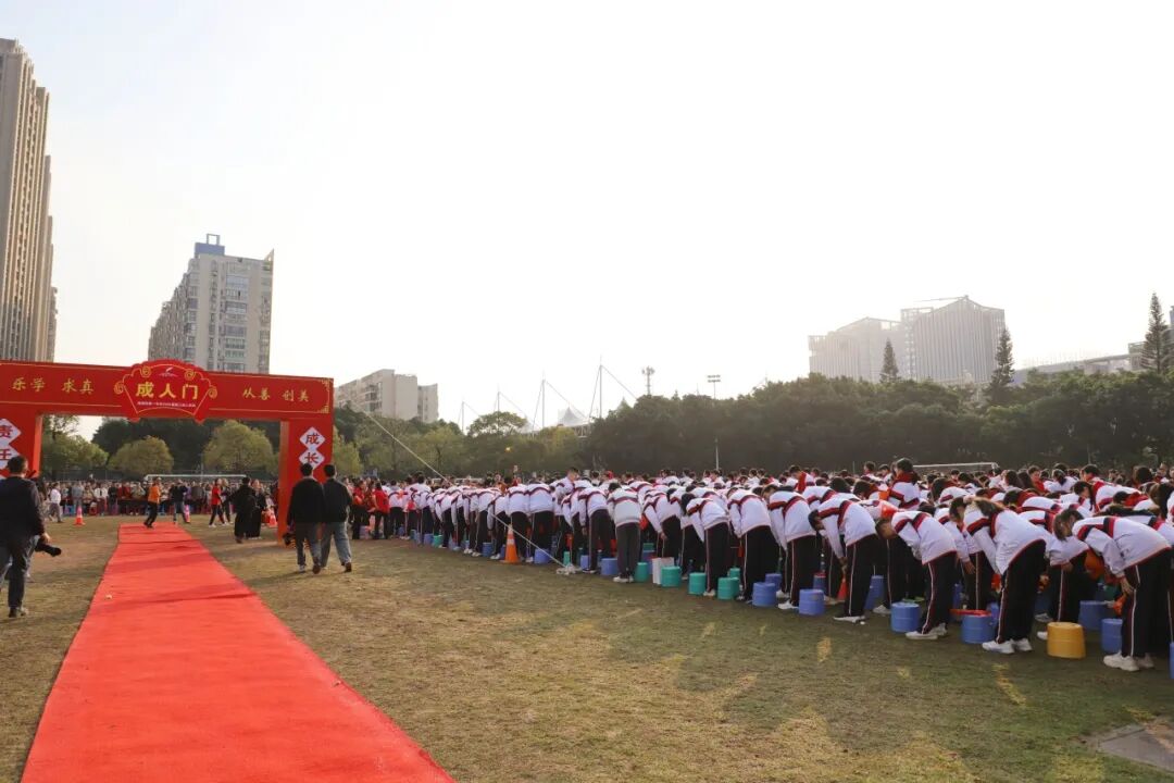全体高三同学向家长、老师们深深鞠躬行感恩礼,既表达了对父母家人十八载养育之恩的感谢,也向默默奉献、辛勤教导的老师们致以诚挚的敬意。