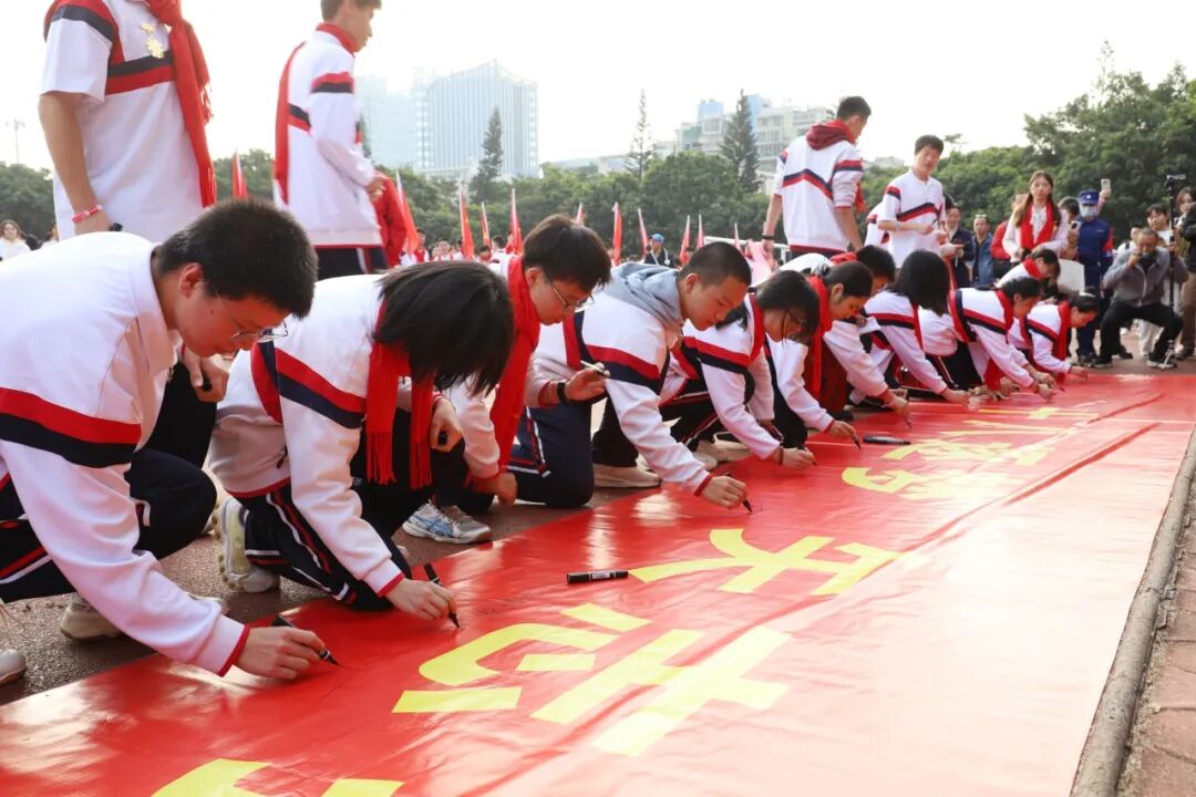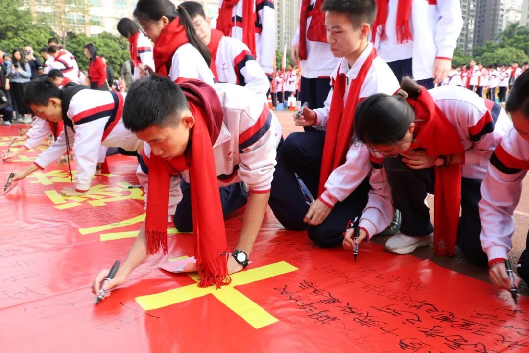 各班学生代表在“十八逐梦 矢志报国”的横幅上写下成人感言:“马到成功,必定辉煌”“为国洒上热血青春!强国有我”“笔底波澜书锦绣,胸中丘壑济山河”“少年振衣,岂不可作千里风幡看?少年瞬目,亦可壮作万古清流想”……