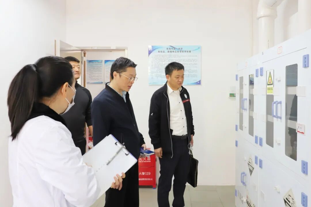 习恩民局长一行深入校园,对教学区、生活区等重点场所进行了全面、细致的检查。在学生宿舍,检查组实地查看了宿舍内务卫生、用电安全、消防设施及通道,详细了解了日常管理、安全巡查及学生住宿情况。在化学仪器试剂室,检查组着重对易制毒、易制爆等管制类化学品的储存、管理、使用记录及安全防范措施进行了专项督查,并仔细查验了相关消防设施器材配备与安全操作规程。习恩民局长还走进高三年级办公室,与高三年级管理团队亲切交谈,深入了解高三学生的学习状态、心理状态与备考进展。通过全方位、多环节的实地检查,检查组对我校细致扎实的常态化安全管理工作给予了肯定。