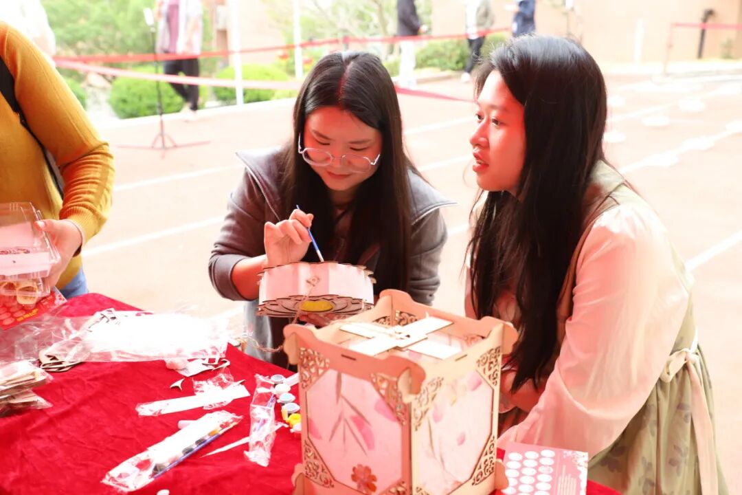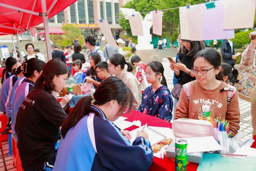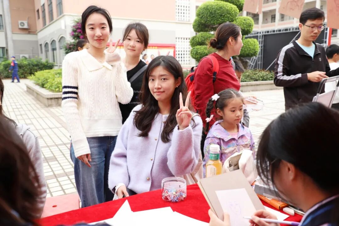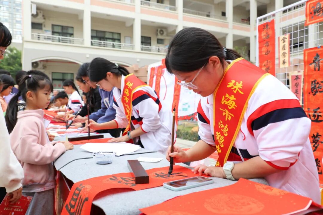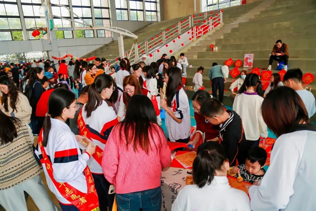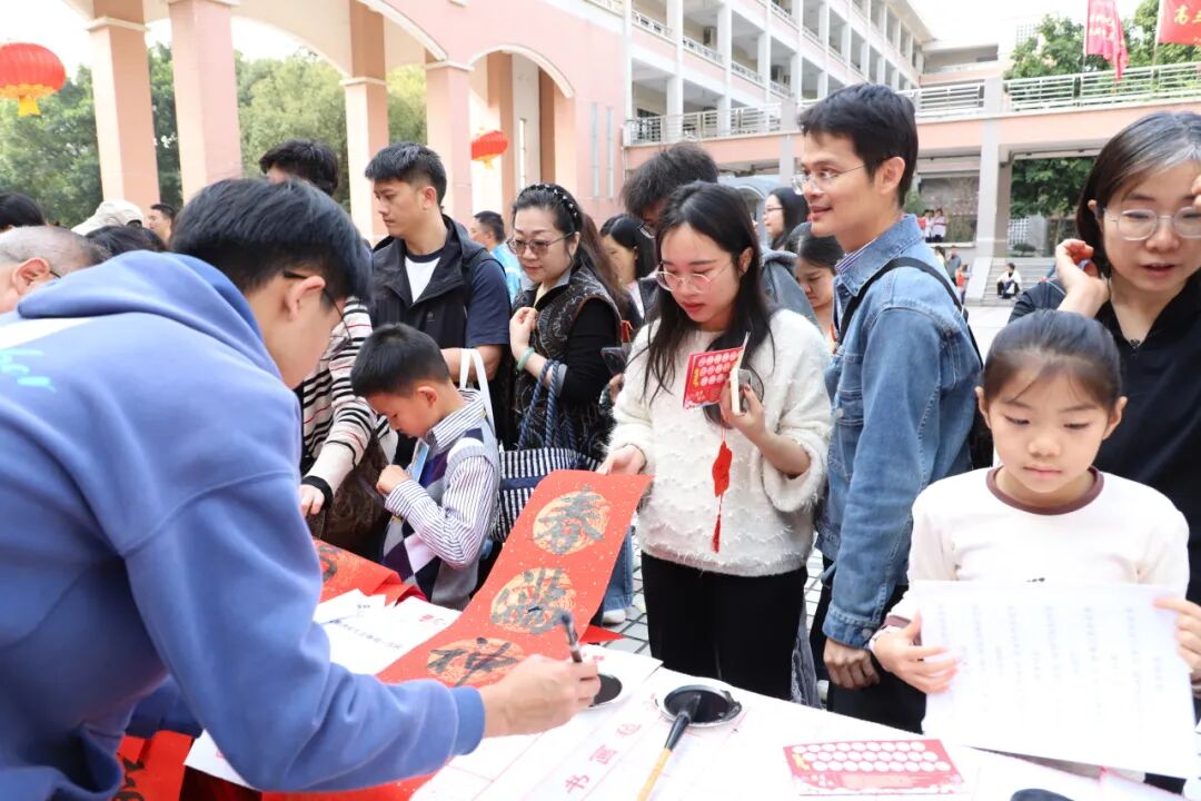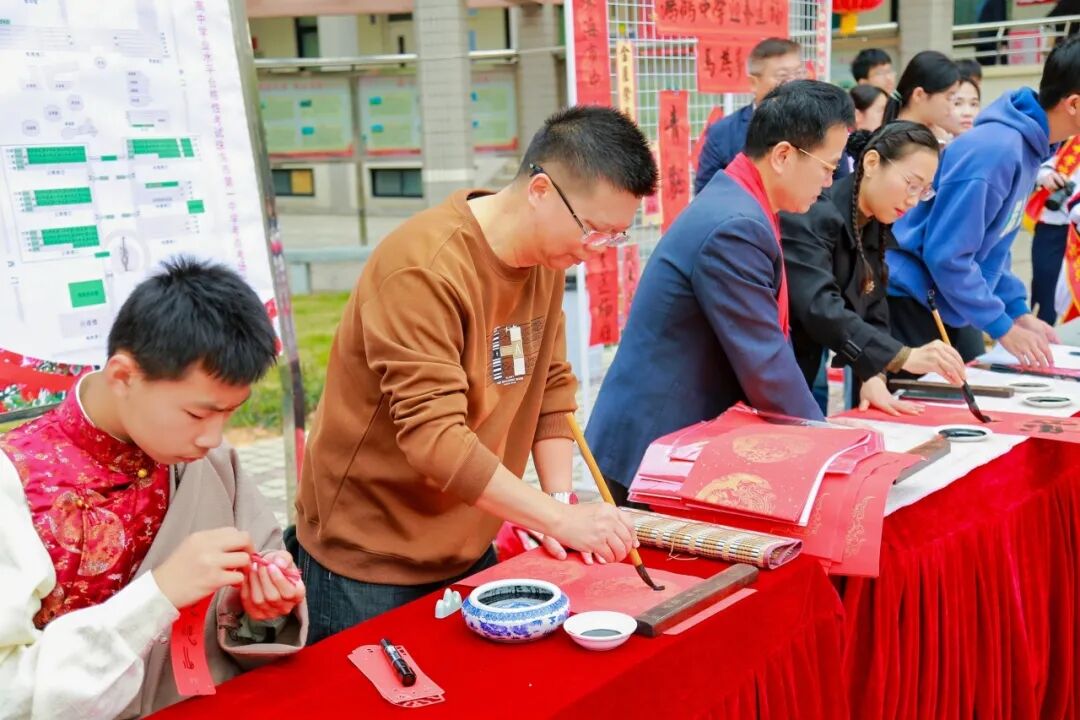 游园会现场,传统文化体验区成为最受欢迎的角落。书法台前,教职工和学生志愿者们挥毫泼墨,一副副春联、一张张福字在笔尖诞生。