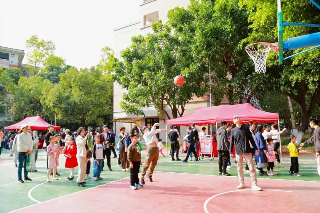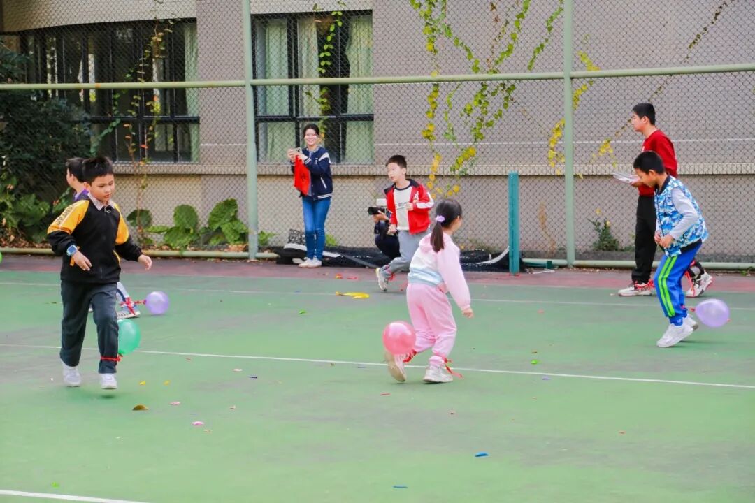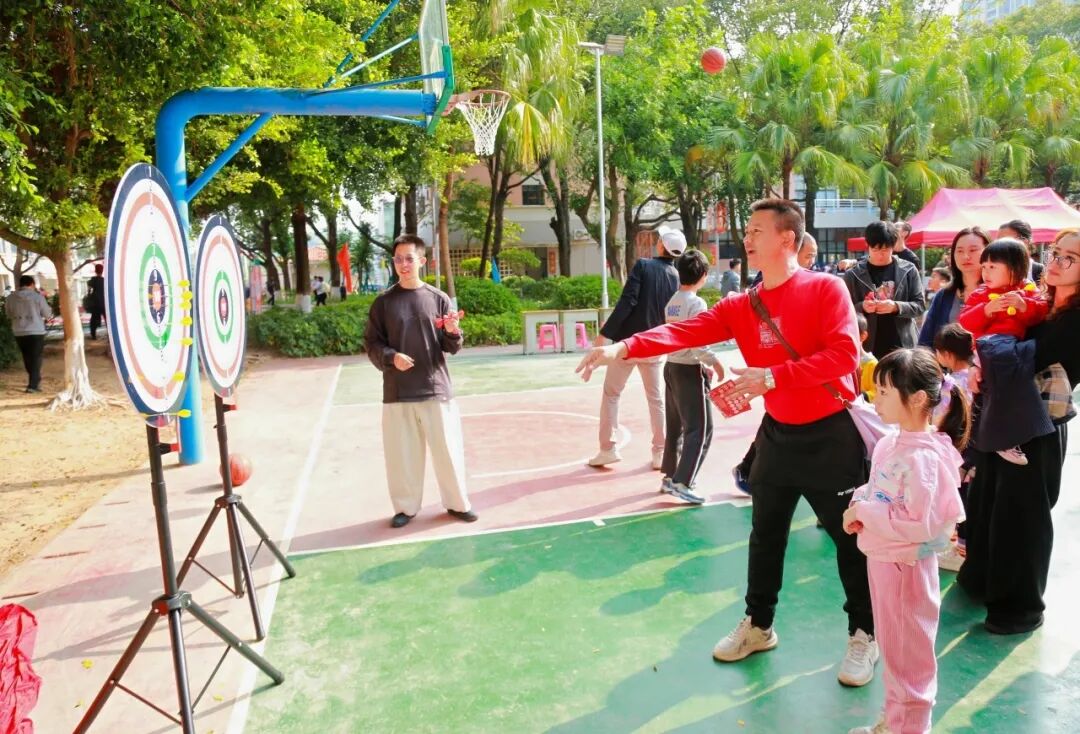 篮球架下,教师们展示着课堂外的运动风采;踩气球区域,孩子们追逐嬉戏,清脆的爆破声与笑声交织。