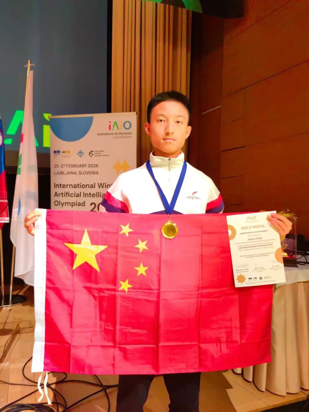 当地时间2月27日,在斯洛文尼亚首都卢布尔雅那举办的2026国际冬季人工智能奥林匹克竞赛(IAIO)闭幕。本届赛事为第二届,吸引了全球24个国家和地区的95名选手参加。中国和中国澳门代表队均系首次参赛,分别派出4名选手,斩获两金、一银和三项优胜奖的优异成绩。其中,珠海市第一中学高二年级陈剑栩同学凭借卓越的科技素养与创新能力,在激烈的国际赛事角逐中脱颖而出,成功斩获金牌。这不仅是他个人的高光时刻,更是代表中国队在IAIO赛事中取得了首次金牌与历史性突破。