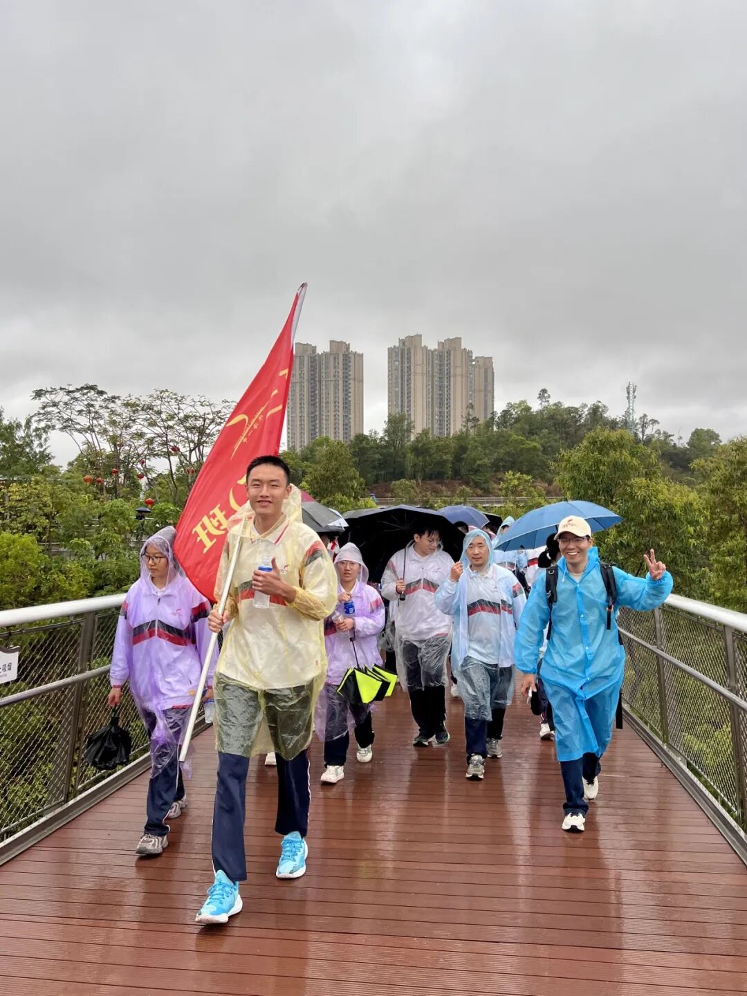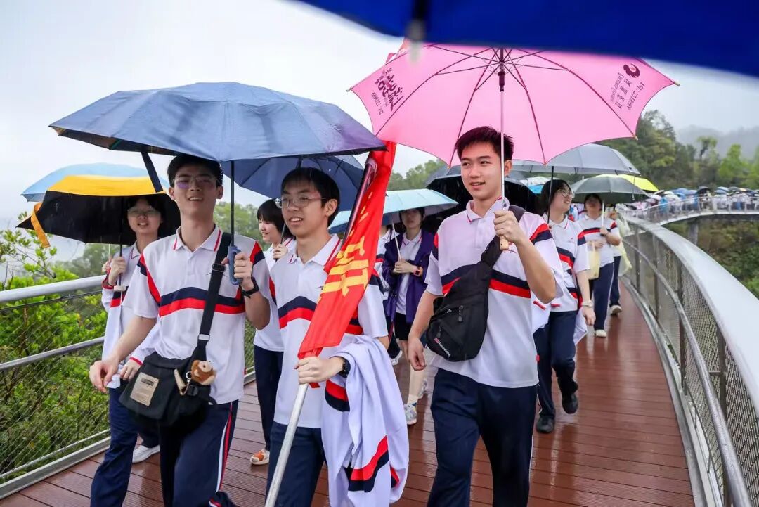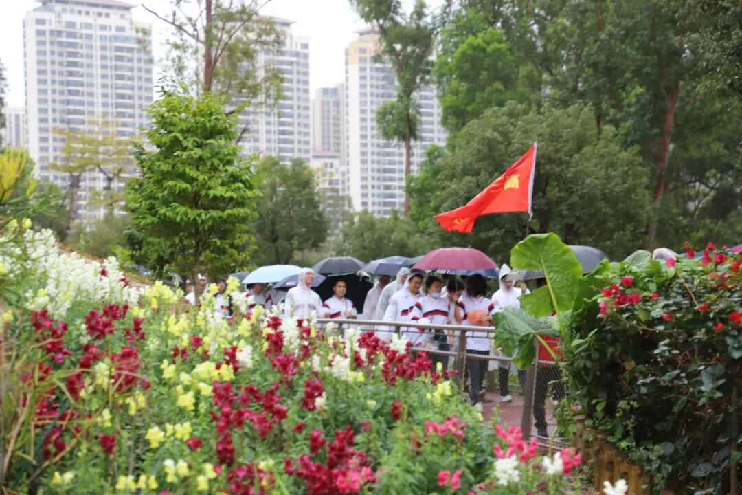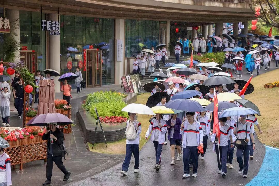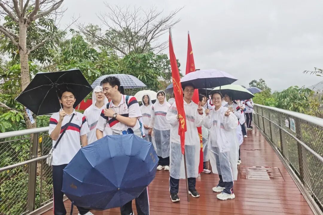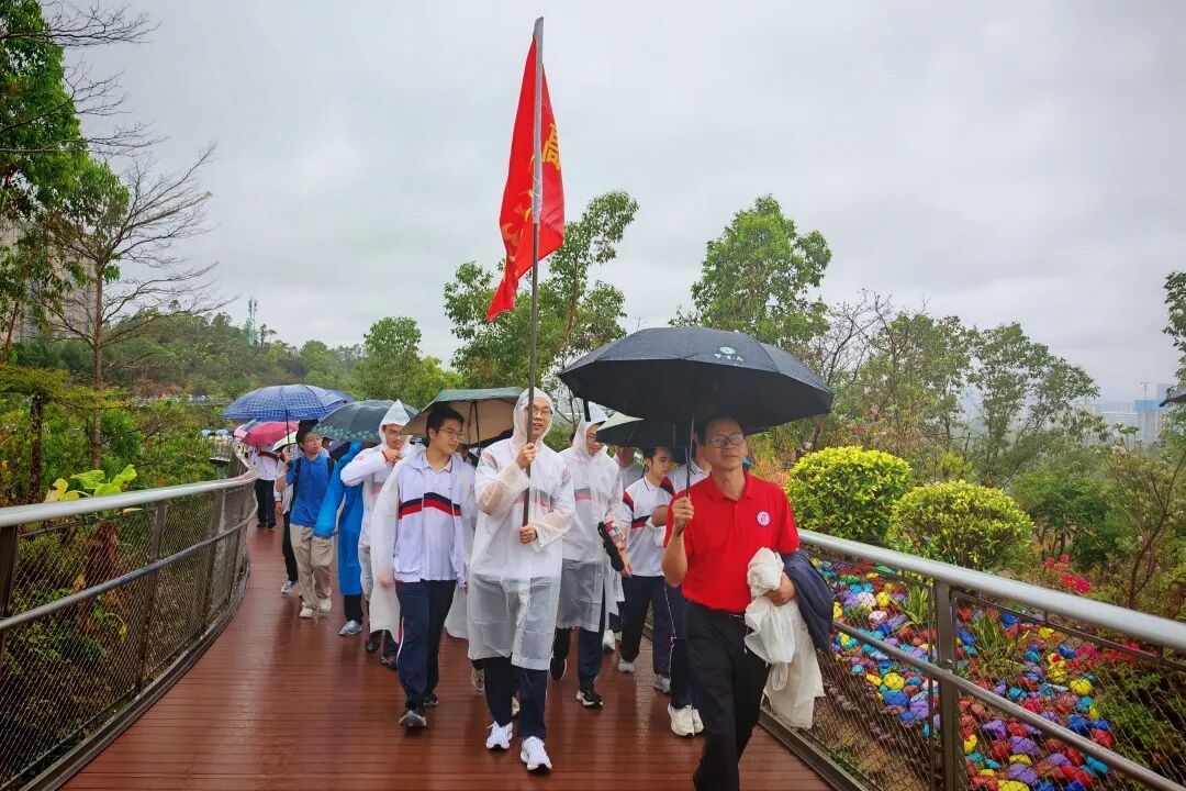 天公虽不作美,但如酥的春雨却为这场远足增添了几分诗意与考验。师生们精神抖擞,五彩斑斓的雨衣宛如山间绽放的花朵,为雨中的香山云道注入了无限生机。