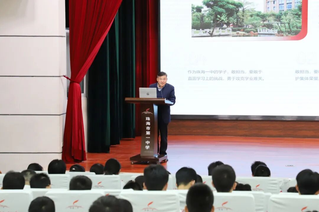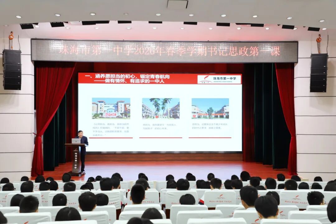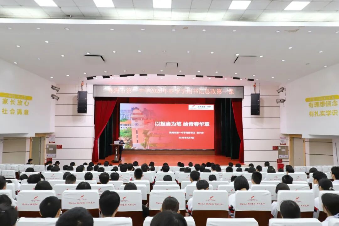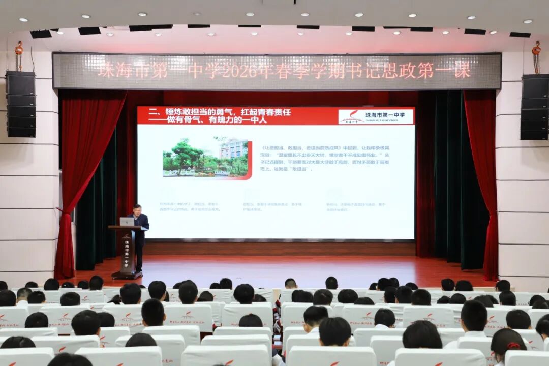 春潮涌动启新程,奋楫扬帆正当时。2026年3月4日,珠海市第一中学在报告厅举行新学期书记思政第一课。校党委书记张六安以“以担当为笔 绘青春华章”为主题,带来一堂深刻且振奋的思政教育课,引导一中学子涵养担当精神,以愿担当、敢担当、善担当的姿态,在青春赛道上奋力奔跑,以青春之我筑强国之梦。